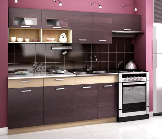 Moderní a levná kuchyňská sestava je navržena tak, že skříňky se dají poskládat v libovolném pořadí. To Vám umožní sestavit si kuchyň dle Vašich potřeb a představ. Korpus je bílé barvy, sokl je v barvě dub devon a pracovní deska v barvě petra béžová. Pracovní deska je dělená podle velikosti spodních dvířek 2 x 50 cm (kromě skříňky na dřez). Dvířka jsou v barvě dub devon v kombinaci s kaštanem. Sklo ve vitríně je s páskami a vitrína má výklopné otevírání nahoru.