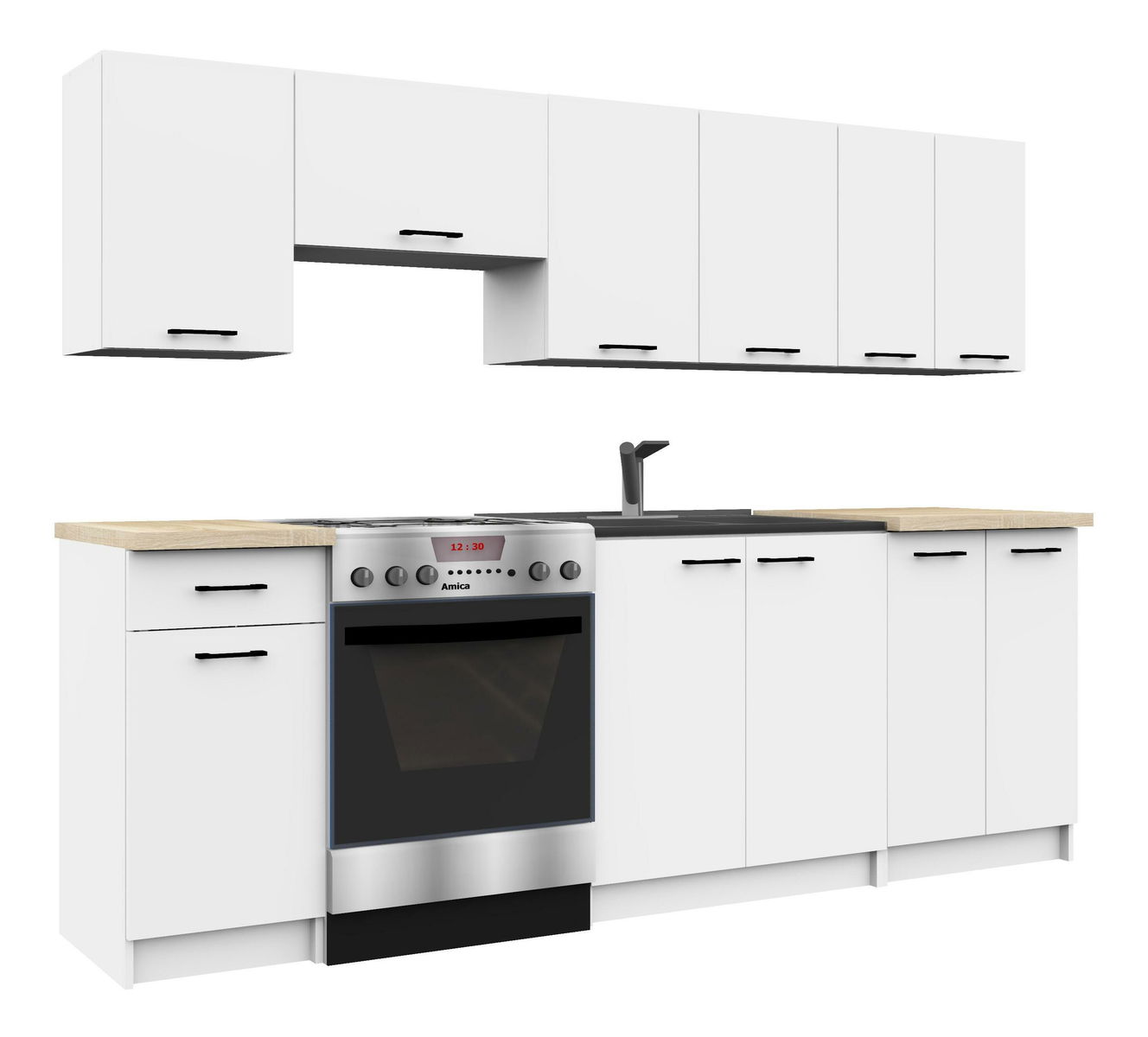 Ozara 31 je důkazem, že i kompaktní kuchyně může nabídnout velké věci. Díky rozumně navržené sestavě skříněk získáte prostor, kde má všechno své místo – bez kompromisů. Dolní skříňka s výsuvnou zásuvkou S50 SZ1 je ideální pro uložení příborů či kuchyňských pomůcek, zatímco široká skříňka S80ZL zajišťuje stabilní základnu pro pracovní plochu. Praktická kombinace horních skříněk různých šířek (W80, W60, W50) nabízí flexibilní uskladnění potravin i nádobí a zajišťuje, že vše máte po ruce, bez zbytečného hledání. Vestavěná skříňka W60OK vytvořená pro digestoř elegantně schová technologii, ale zachová čistý vzhled. Bílá barva celého sestavení nejen opticky zvětšuje prostor, ale zároveň vytváří neutrální základ, který si rozumí s jakýmkoli stylem doplňků. Ozara 31 je kuchyně, kde funkce hraje hlavní roli a design jí sekunduje s nenápadnou elegancí.
