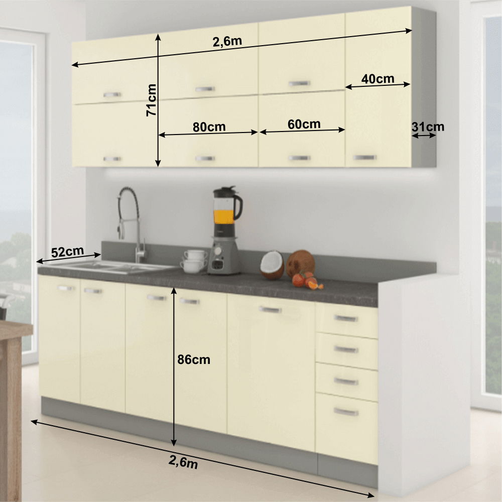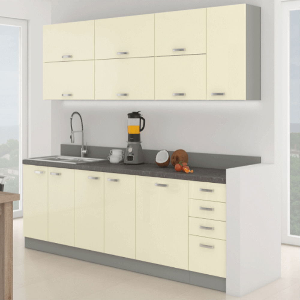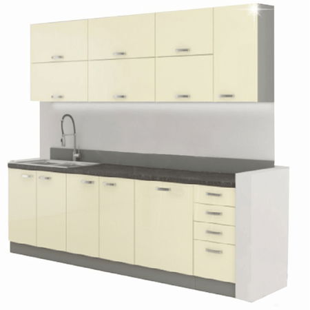 Kuchyně Primula v krémově bílé barvě as extra vysokým leskem dodává pocit luxusu a elegance do vašeho domova. Tato kuchyně s MDF horními skříňkami a vysokým leskem na spodních dvířkách má šířku 260 cm a obsahuje pracovní desku a dolní lištu. Dvířka jsou vybavena tlumiči s tichým zavíráním a úchyty z kovu. Kuchyň je vyrobena z DTD laminovaného materiálu a její moderní design poskytuje dostatek úložného prostoru. Kuchyň se dodává v demontu a lze dokoupit univerzální levý/pravý dřez LAY ON a pracovní desku navíc.