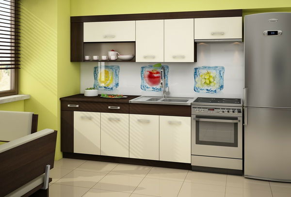Moderní kuchyně s šířkou 240 cm, 60 cm hloubkou a výškou 200 cm. Provedení korpusu je wenge a dvířek skříněk je krémová barva. Masivní šedé úchyty umístěny vodorovně.