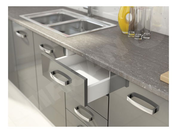 všechny hrany jsou dýhované: zadní hrana je dýhovaná bílou barvou, přední strana a boky jsou v barvě kuchyňské desky,