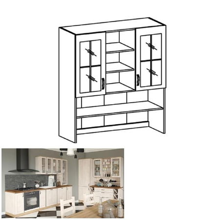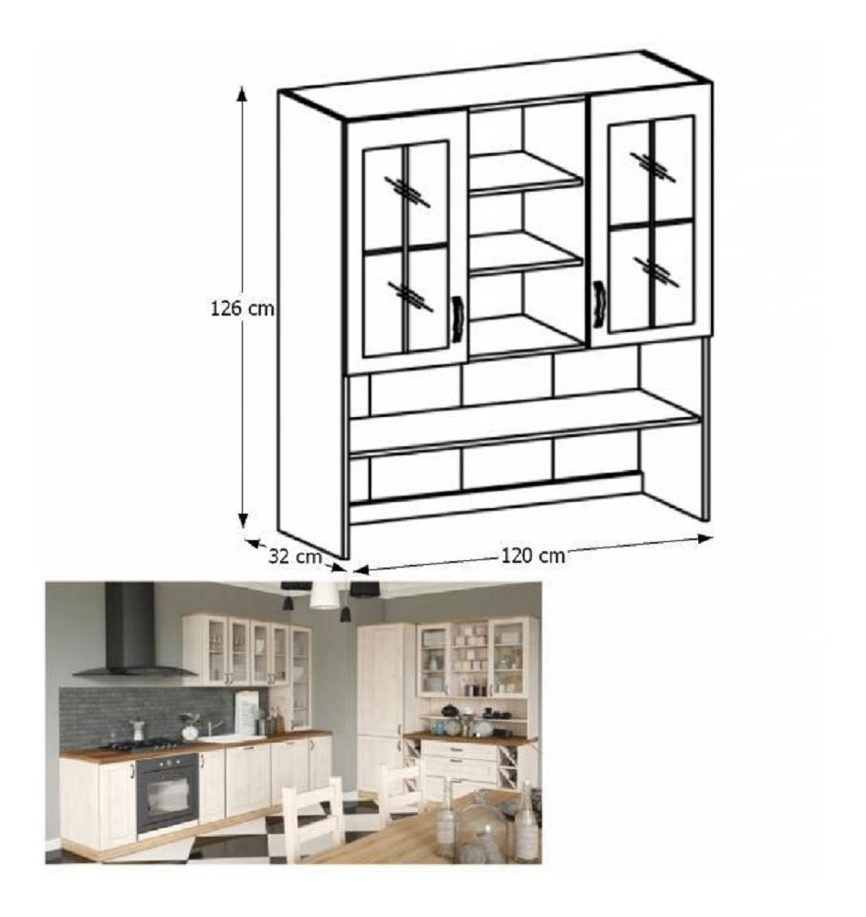 Kuchyňská vitrína nebo nástavba s dvířky. Vybavená je 3 policemi a dvěma prosklenými dvířky, které jsou umístěny po rozích nástavby. Kuchyňský systém v provensálském stylu, korpus je vyroben z kvalitní laminované dřevotřísky v barevném provedení sosna skandinávská s doplňkovým dekorem dubu divokého. Svislý úchyt. Korpus je bílé barvy a přední dvířka jsou krémové.