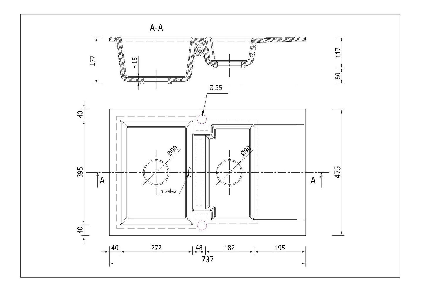 Dřez je dodáván s manuálním nástěnným sifonem. Ve dřezu se nenachází otvor pro baterii.