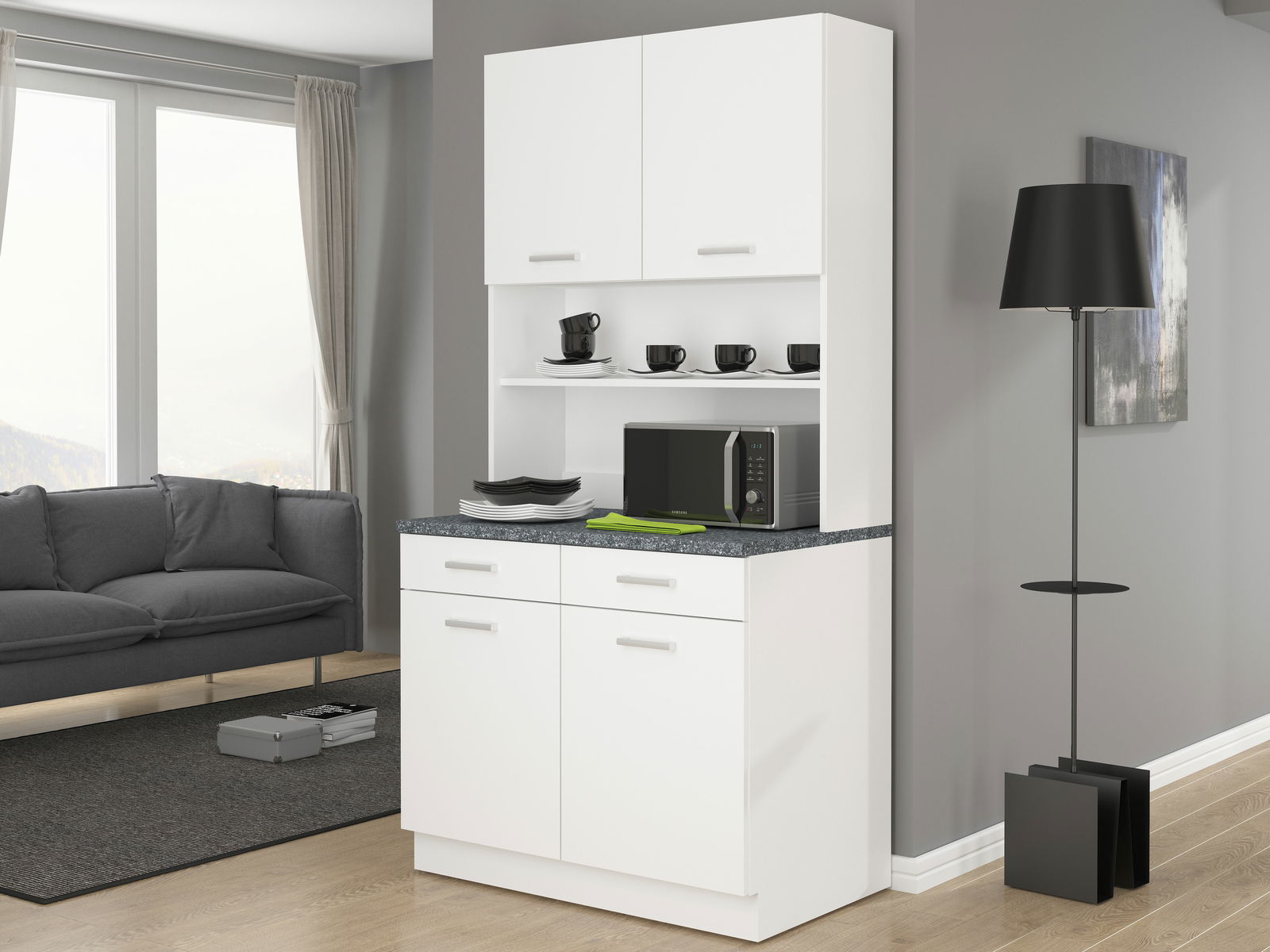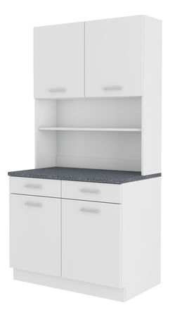 ZobrazitKuchyňský kout Meruna ŠxHxV: bílá o výšce 200 cm, šířce 100 cm a hloubce 56,6 cm je ideální pro menší kuchyně. Využijete jeho praktické řešení, které sestává z horního úložného prostoru se dvěma dvířky a jednou poličkou, otevřeného prostoru pro uložení dekorativních předmětů a dolní skříňky se dvěma šuplíky a dvěma dvířky, které skrývají ještě jednu poličku. Vnitřek skříněk je bílá, což dodává koutu čistý vzhled. Nechybí ani dostatek pracovní plochy pro přípravu jídel. Kuchyňský kout Meruna je praktickou a stylovou volbou pro každou kuchyni.