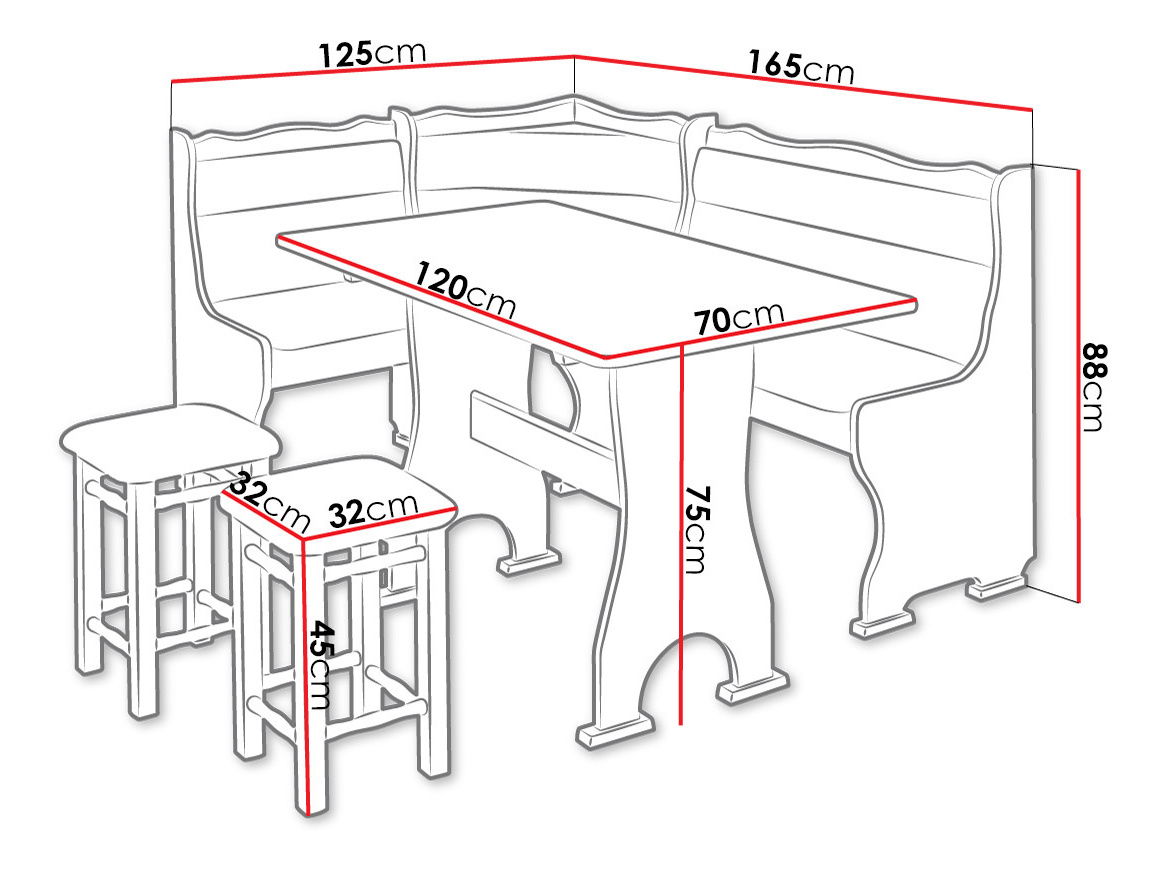 Kuchyňský kout + stůl s židlemi je ideální volbou pro ty, kteří hledají pohodlí a styl. Rozměry jednotlivých prvků: Kuchyňský kout: délka: 165 cm, šířka: 125 cm, výška: 88 cm, Stůl: délka: 120 cm, šířka: 70 cm, výška: 75 cm, Židle ( x 2 ): šířka 32 cm, výška 45 cm, hloubka 32 cm + 3 cm silná pěna, čalouněné opěradlo + 2 cm silná pěna, lavice mají dva úložné prostory, podnož stolu vyrobená z olšového dřeva, vrchní část vyrobena z desky o tloušťce 20 mm, židle vyrobena z olše, čalouněného sedátko + pěna s tloušťkou 2