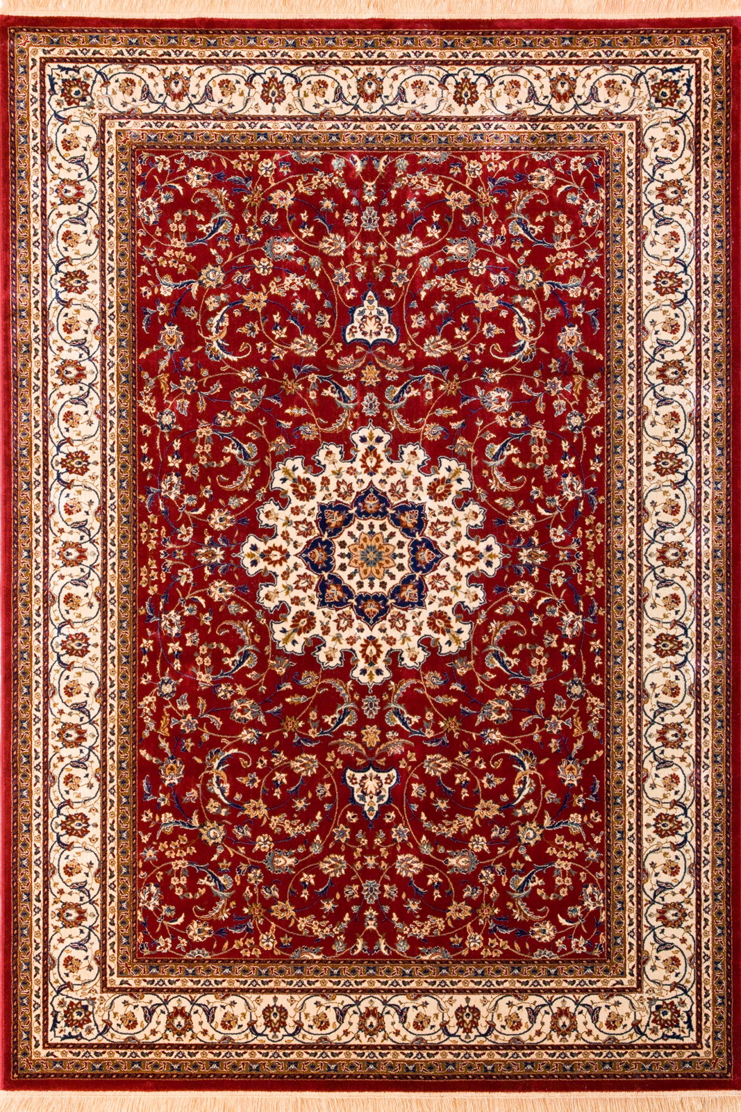 Kashmir 815 Ivory v červené barvě je tvořen vzorem orientálních květinových růžic, ostřejší barvy s květinovým vzorem a pozadí koberce dodávají exkluzivní vzhled. Vyrábí se ze 100 % viskózy.