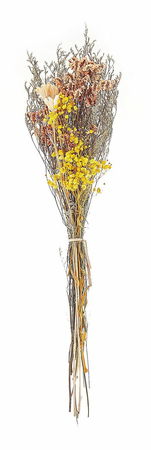 Vneste do svého interiéru špetku barevnosti v podobě této krásné kytice uvázané z okrasné trávy a květin gypsomilky. Její zářivý vzhled v okamžiku naplní celou místnost veselou a příjemnou atmosférou. Kytice zabalená v papíře je ozdobena slaměnou stuhou.