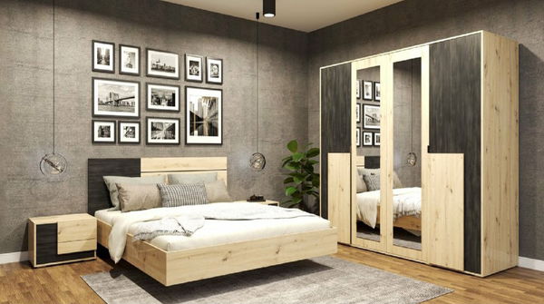 Ložnice Barca představuje moderní a stylový design, který kombinuje přírodní dřevěné prvky s tmavšími akcenty, čímž vytváří elegantní a útulný prostor pro odpočinek. Tato ložnicová sestava je navržena s důrazem na funkčnost a estetiku, přičemž její design dokonale zapadne do současného interiéru. Postel je robustní a pohodlná, s čistými liniemi, které zdůrazňují moderní vzhled. Hlavním prvkem je čelo postele, které kombinuje světlé dřevo s tmavými plochami, čímž přidává na vizuální přitažlivosti. Prostorná šatní skříň se zrcadlovými dveřmi poskytuje dostatek úložného prostoru, zatímco zrcadla opticky zvětšují místnost a přidávají jí světlost. Noční stolky, které jsou součástí sestavy, nabízí praktický prostor pro odkládání osobních věcí. Ložnice Barca je ideální volbou pro ty, kdo si potrpí na moderní a funkční design, který zároveň přináší do ložnice pocit pohodlí a elegance. Díky kombinaci světlého dřeva a tmavších akcentů je tato ložnice nadčasová a přizpůsobí se různým stylům interiéru.