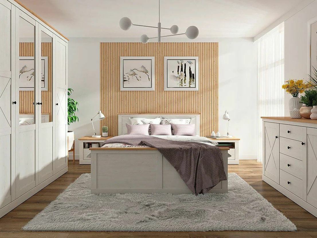Ložnice Frija je dokonale přeměňuje běžný interiér na domov s charakterem. ním představitelem venkovského stylu, který přináší do vašeho domova jemnou eleganci a útulnou atmosféru. Tato ložnicová souprava je navržena tak, aby spojovala tradiční prvky s moderním pohodlím, čímž vytváří ideální místo pro odpočinek a relaxaci. Hlavní charakteristikou ložnice Frija je kombinace bílé barvy s přírodními dřevěnými prvky, které společně vytvářejí harmonický a teplý vzhled. Bílé povrchy přinášejí světlost a čistotu, zatímco přírodní dřevo dodává nábytku autentický a rustikální charakter.Detailně propracovaný design, který zahrnuje jemné linie a klasické tvary, dodává ložnici Frija pocit tradičního venkovského šarmu. Tato ložnice je ideální pro ty, kteří hledají spojení estetiky a funkčnosti, s dostatkem úložného prostoru a kvalitním zpracováním, které zaručuje dlouhou životnost. Ložnice Frija přinese do vašeho domova pocit klidu a příjemné venkovské atmosféry, kde každý den začíná s úsměvem a pohodlím a přináší rovnováhu mezi pohodlím a stylem.