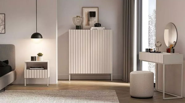 Ložnice Derrick je víc než jen nábytek – je to atmosféra. Součástí řešení pro moderní interiér, vynikajícím svým minimalistickým designem a funkčními prvky. Set zahrnuje stylový noční stolek, prostornou komodu se strukturovaným povrchem a kosmetickým stolkem s kulatým zrcadlem. Všechny kusy nábytku jsou vyhotoveny v čistých liniích a světlých barvách, což dodává místnosti vzdušnost a sofistikovanost. Tento set je ideální pro ty, kdo hledají nábytek s moderním designem a praktickým využitím, který zároveň vytváří harmonické a klidné prostředí, která zanechá dojem a pocit výjimečnosti.