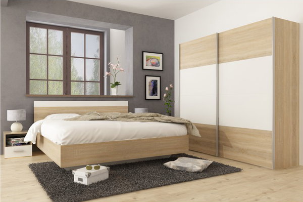 Moderní ložnicová sestava s přitažlivým designem pomocí které si zařídíte ložnici se vším, co potřebujete. Sestava se skládá z manželské postele, dvou nočních stolků a prostorné šatní skříně. Šatní skříň Vám poskytne úložný prostor pro Vaše oblečení a jiné doplňky. Noční stolky mají otevřenou poličku a zásuvku, kam si můžete uložit oblíbenou knížku na čtení, brýle nebo kosmetiku. Postel je bez čela u nohou a stojí na podstavci, čímž vzniká iluze levitující postele.