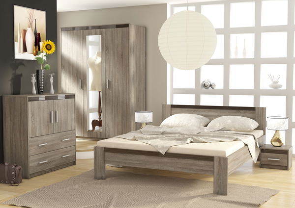 Ložnicová sestava v moderním barevném provedení dřeva dub sonoma truflový zútulní Vaši ložnici a udělá z ní moderní prostor. Komplet se skládá ze čtyř komponentů. Šatní skříň, která má troje dveře, přičemž na středních je zrcadlo. Komoda s dvěma dvířky a dvěma zásuvkami, dva noční stolky se zásuvkou a manželskou postel s plochou lůžka 160 x 200 cm. Dekor nábytku je doplněn o hnědé MDF lišty.