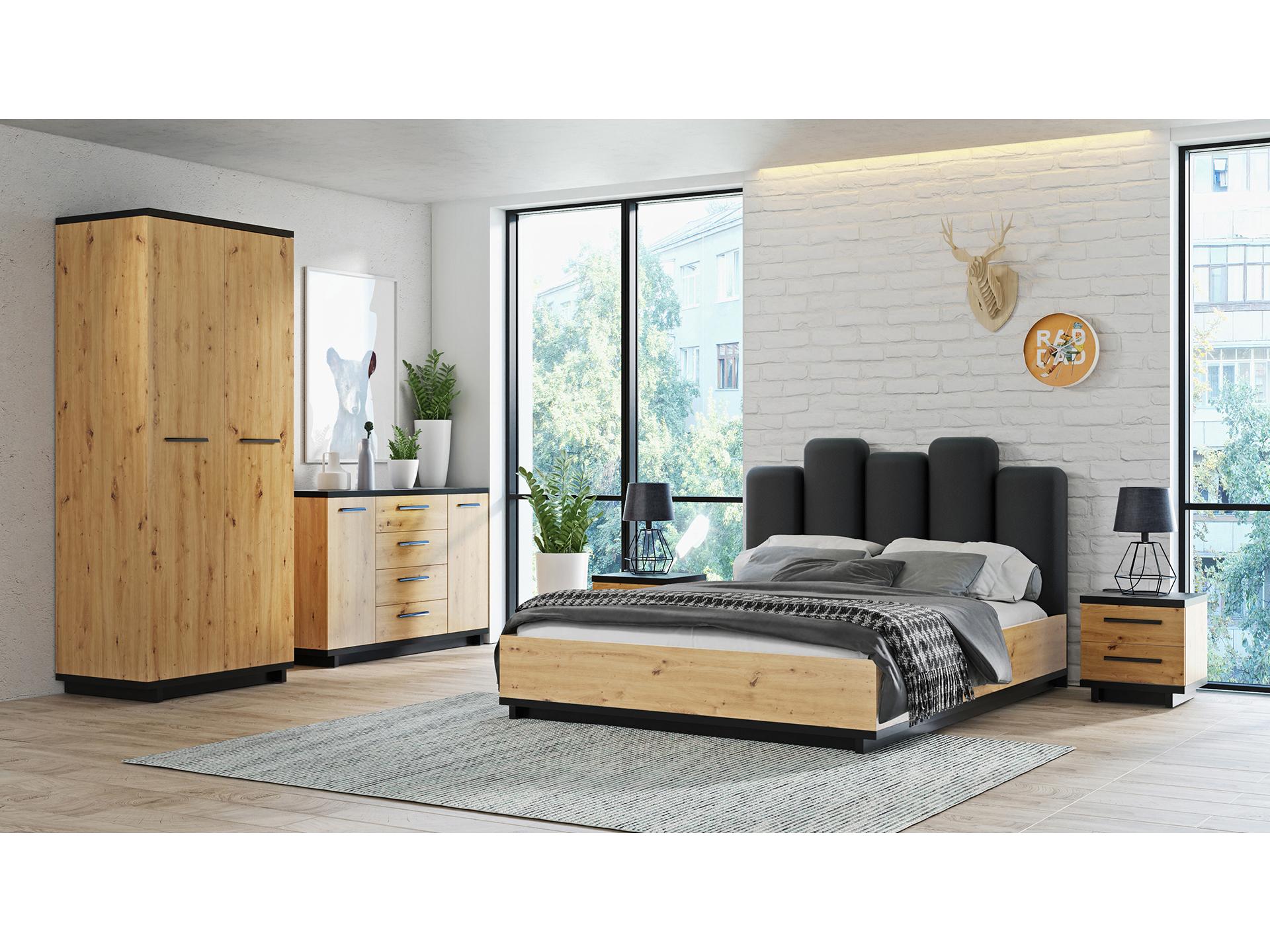 Pokud hledáte ložnici, která v sobě spojuje přírodní teplo dřeva s moderní elegancí, sestava Indi 3 je tou pravou volbou. Kombinace dubu artisan a černé matné barvy vytváří harmonický a stylový prostor k odpočinku. Prostorná policová skříň, praktická komoda a noční stolky nabízí dostatek úložného prostoru, zatímco manželská postel s pevným roštem vás zve k pohodlnému spánku. Tato ložnice změní váš domov na místo plné klidu a vkusu.