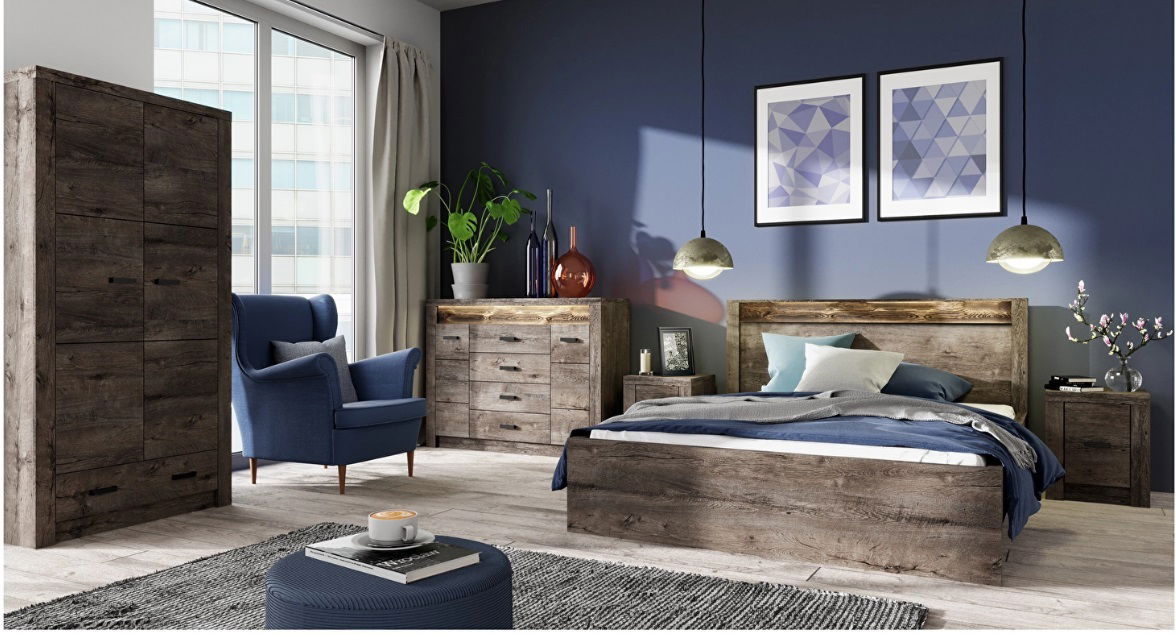 Ložnice Indie je víc než jen nábytek – je to atmosféra. Ideální pro ty, kdo hledají tradičního dřevěného nábytku s moderními akcemi. Tato sestava vám poskytne příjemnou atmosféru, ve které budete cítit pohodlně a uvolněně a zároveň poskytne vše potřebné pro organizovaný a stylový interiér. Postel je robustní a pohodlná, s masivním čelem, které přidává na vizuální přitažlivost a zároveň poskytuje stabilitu a komfort. Komoda a noční stolky jsou prakticky navrženy, aby poskytovaly dostatek úložného prostoru, přičemž zachovávají jednotný a harmonický vzhled místnosti. Šatní skříň s dostatkem úložného prostoru je doplněna o kvalitní kovové úchyty, které poskytují nábytek moderní nádech, která zanechá dojem a pocit výjimečnosti.