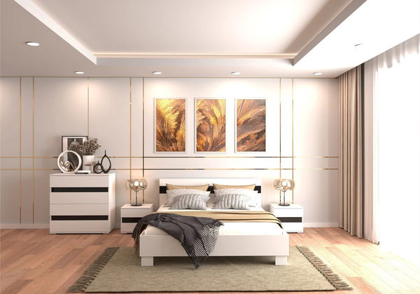 Ložnice Luzir je vynikej vás okouzlí svou harmonií a praktičností. Soucim příkladem jednoduchosti a elegance v moderním designu. Tato ložnicová sestava se vyznačuje čistými liniemi a minimalistickým stylem, který dokonale zapadne do každého interiéru. Světlé barevné tóny a jemné kontrasty vytvářejí klidné a útulné prostředí, ideální pro relaxaci. Postel je centrálním prvkem této sestavy, její jednoduchý a moderní design zajišťuje maximální pohodlí. Noční stolky a komoda poskytují praktický úložný prostor, přičemž jejich design je v souladu se zbytkem nábytku, čímž se dosahuje harmonického vzhledu celé místnosti. Ložnice Luzir je ideální pro ty, kteří preferují minimalistický přístup k interiérovému designu, ale zároveň si potrpí na kvalitu a funkčnost. Díky své jednoduché eleganci tato ložnice přinese do vašeho domova pocit klidu a čistoty, čímž vytvoří perfektní prostředí pro odpočinek a pohodlí, ale vytváří místo plné pohody a vkusu.