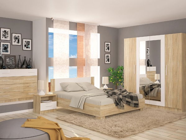 Ložnice Marlon 2 pon vás zve zpomalit a užívat si přítomný okamžik. Nabízí komplexní pro vaši ložnici, spojující moderní styl s řešením. Tento set obsahuje pohodlnou manželskou postel s vysokým čelem, dvě noční stolky a prostornou praktickou šatní skříň s posuvnými dveřmi a zrcadly, které vizuálně zvětšují prostor. Všechny kusy nábytku jsou vyhotoveny v dekoru světlého dřeva (sonoma), což přináší do místnosti příjemnou a harmonickou atmosféru. V kombinaci úložného prostoru a elegantního designu činí z tohoto setu maximálně maximálně pro každou moderní ložnici, který podporuje relaxaci a rodinné spojení.