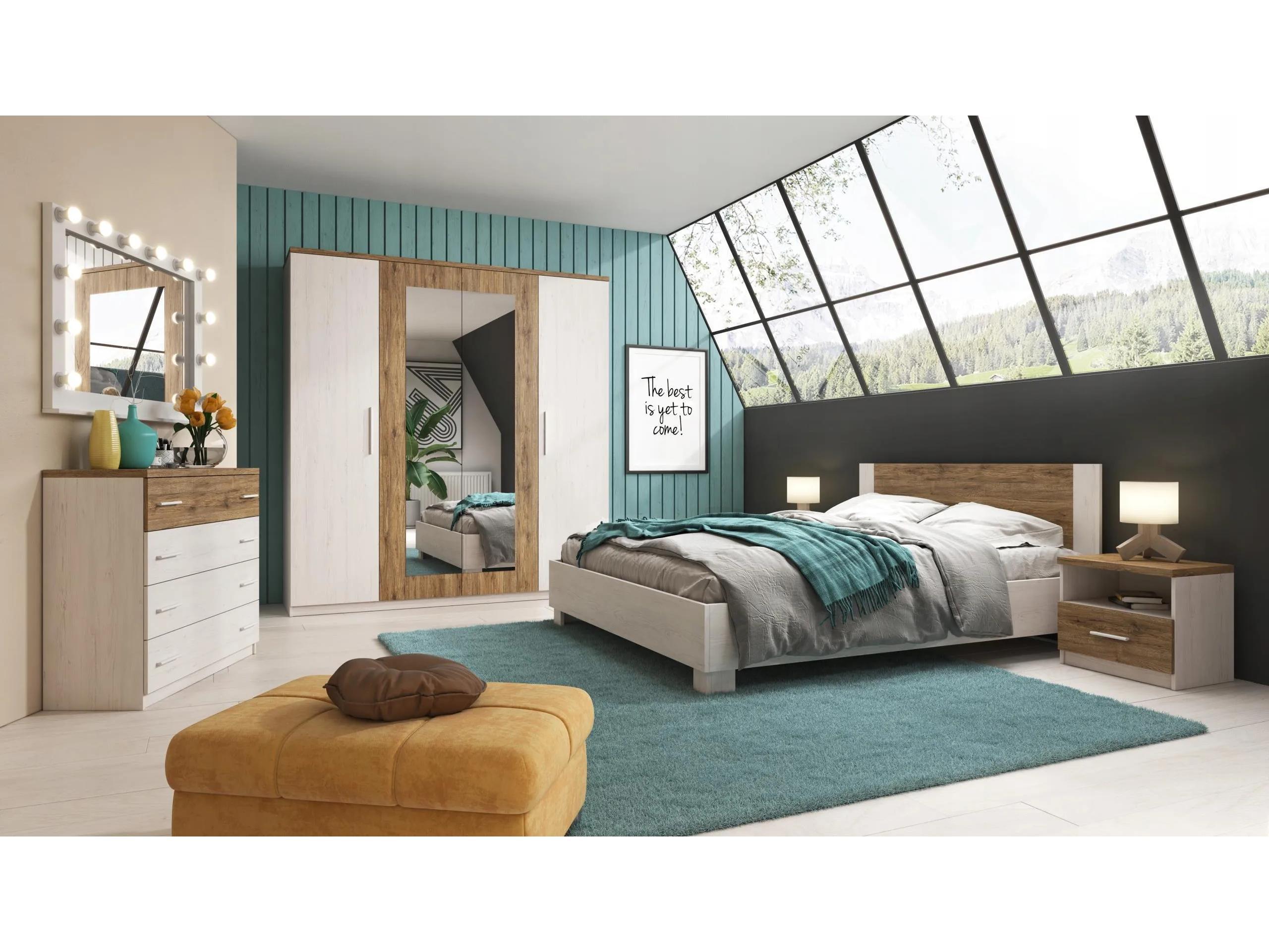 Ložnice Marlon 3 v kombinaci borovice andersen a dubu vytváří světlý, útulný a moderní prostor. Manželská postel s roštem poskytuje pohodlí a stabilitu, zatímco komoda a dvoudveřová šatní skříň nabízí praktická úložná řešení. Dva noční stolky doplňují sestavu funkčně i designově. Díky harmonickému spojení světlého dřeva a přírodních tónů působí místnost vzdušně a příjemně.
