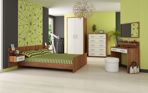 Tento komplet obsahuje všechny prvky, které potřebujete k zařízení ložnice. Postel s dvěma nočními stolky, praktickou zásuvkovou komodu, prostornou šatní skříň, toaletní stolek a zrcadlo. Na výběr máte ze čtyř barevných provedení. Vyobrazená ložnice je v barevném provedení dřeva švestka s bílými prvky.