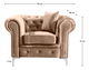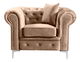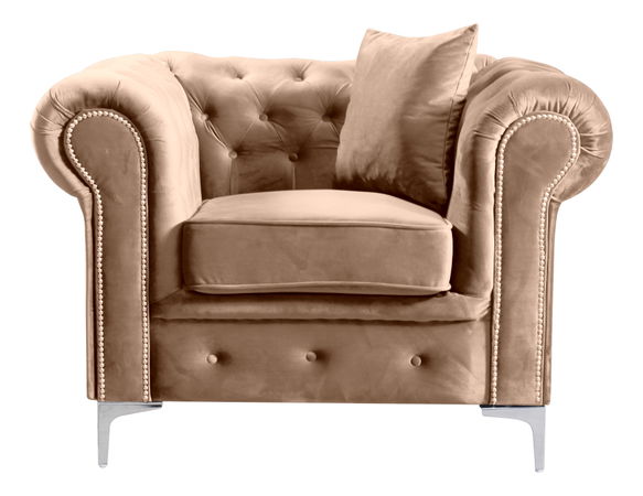 Elegantní a luxusní obývací pokoj s křeslem Rikaro se stane skutečností. Čalouněné je světle hnědou látkou Velvet, která přidává na noblesu. Křeslo je celočalouněné a jeho umístěním do prostoru získáte nepřehlédnutelný prvek, který upoutá na první pohled. Stabilitu zajišťují kovové nohy ve stříbrné barvě. Toto impozantní křeslo je hrdým zástupcem stylu Chesterfield, jehož reprezentují zakřivené opěrky ruky, tělo bohatě zdobené knoflíky a prošívané čalounění. Dodáváno je s jedním dekorativním polštářem. Sedací část je připevněna suchým zipem, takže lze snadno skládat. Nádherně vynikne nejen v obýváku, ale také v kanceláři, hale či jiných reprezentativních prostorách.