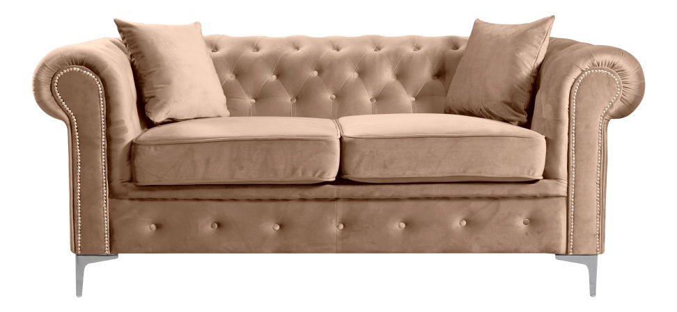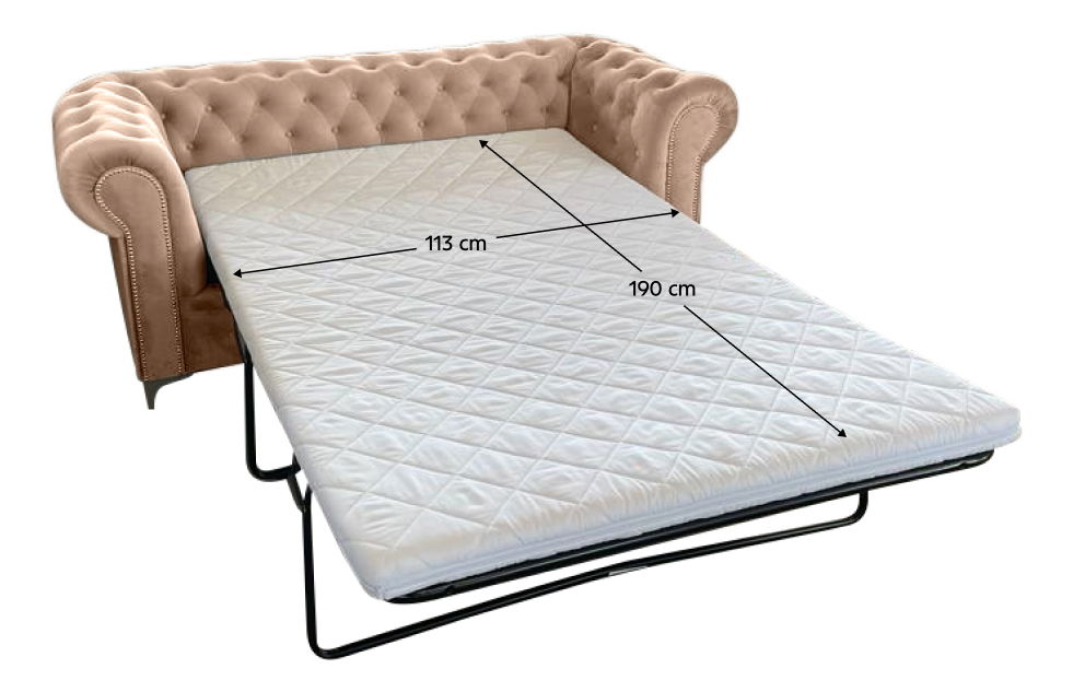 Na kovových nožičkách, Celočalouněný, Noblesní, Luxusní, Chesterfield, Prošívaný, Rozkládací, Dekorativní knoflíky, Dodáván se dvěma polštáři, Sedací část se suchým zipem