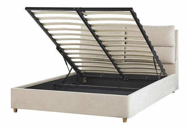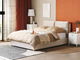 Tato elegantní postel s moderním designem má rám s vysokým čelem a velký úložný prostor. Díky obdélníkovému tvaru působí tradičním dojmem, ale tlusté opěradlo s tlustými polštáři jí dodává moderní šmrnc. Štíhlé, ale pevné a odolné nohy neodvádějí pozornost od elegantního designu a zajišťují stabilitu konstrukce. Postel je čalouněna světle béžovou sametovou látkou, která zvýrazňuje její sofistikovaný a poutavý vzhled.