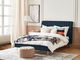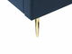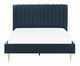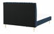Elegantní postel v moderním stylu s vysokým a hrubě vyztuženým opěradlem. Klasický obdélníkový tvar postele doplňuje prošívané čelo, které posteli dodává moderní vzhled. Nohy jsou perfektně vyvážené a neodvádějí pozornost od elegantního designu, ale zajišťují silnou, pevnou a odolnou konstrukci. Celá postel je čalouněna tmavě modrým sametem, který jí dodává sofistikovaný vzhled.