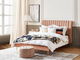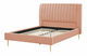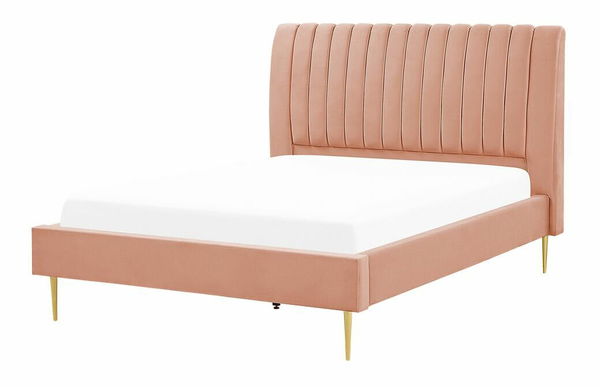 Elegantní postel v moderním stylu s vysokým a hrubě vyztuženým opěradlem. Klasický obdélníkový tvar postele doplňuje prošívané čelo, které posteli dodává moderní vzhled. Nohy jsou perfektně vyvážené a neodvádějí pozornost od elegantního designu, ale zajišťují silnou, pevnou a odolnou konstrukci. Celá postel je čalouněna sametem v broskvovém odstínu růžové, který jí dodává sofistikovaný vzhled.
