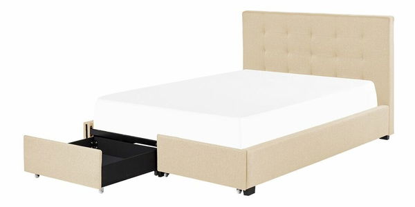 Tato výjimečná postel má elegantní design a nabízí dokonalé pohodlí. Hrubé vyztužené čelo postele s ozdobným prošíváním s knoflíčky se postará o jedinečný pocit luxusu. Čalounění z polyesterové látky se strukturou lnu v elegantním odstínu je odolné vůči opotřebení a snadno se udržuje. Rám postele je vyroben z dýhované překližky a jeho součástí jsou dvě prostorné zásuvky na kolečkách, které nabízejí dostatek úložného prostoru pro odkládání přikrývek a ložního prádla.