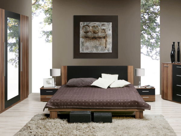 Elegantní manželská postel o šířce matrace 160 cm v provedení ořech a černá barva, která je použita na většině čela postele. Postel je bez úložného prostoru jsou k ní automaticky dodávány 2 noční stolky s dvěma zásuvkami, z nichž je horní v černé barvě.
