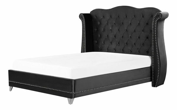 Tato elegantní postel přemění každou ložnici na luxusně zařízený prostor. Rám postele s vysokým čelem je čalouněný sametovou látkou, kterou doplňuje klasické prošívání. Díky svému designu je dokonalým kusem nábytku do ložnic zařízených v elegantním nebo tradičním stylu. Okraje postele zdobí kovové lemování a lamelový rošt nabízí stabilní oporu matraci a zajišťuje správné proudění vzduchu.