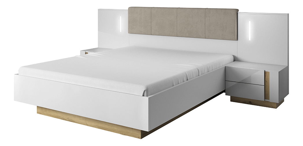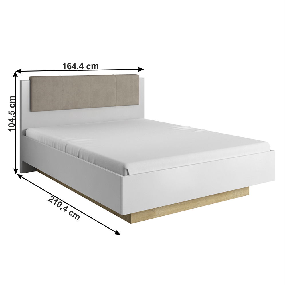 Manželská postel o rozměrech 164,4 x 210,4 x 104,5 cm je vyrobena ze DTD laminovaného materiálu s ABS hrany a nabízí úložný prostor. Dveře jsou vybaveny dotykovým systémem PUSH UP a čelová strana je čalouněná. Postel není dodávána s matrací ani roštem, ale doporučujeme zakoupit lamelový rošt. Barvy k dispozici jsou bílá, dub grandson, bílý lesk a šedohnědá taupe.