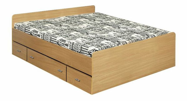 Praktická manželská postel, kterou využijete nejen na pohodlný spánek, ale i na odkládání věcí. To díky úložnému prostoru pod lůžkem, který je rozčleněn na tři části v podobě zásuvek. Je vyrobena z laminované DTD v barevném provedení dřeva buk. Plocha lůžka je 160 x 200 cm a je dodávána bez roštu a matrace. Ty si můžete vybrat a přiobjednat z nabídky našeho internetového obchodu.