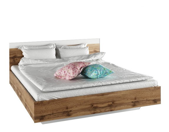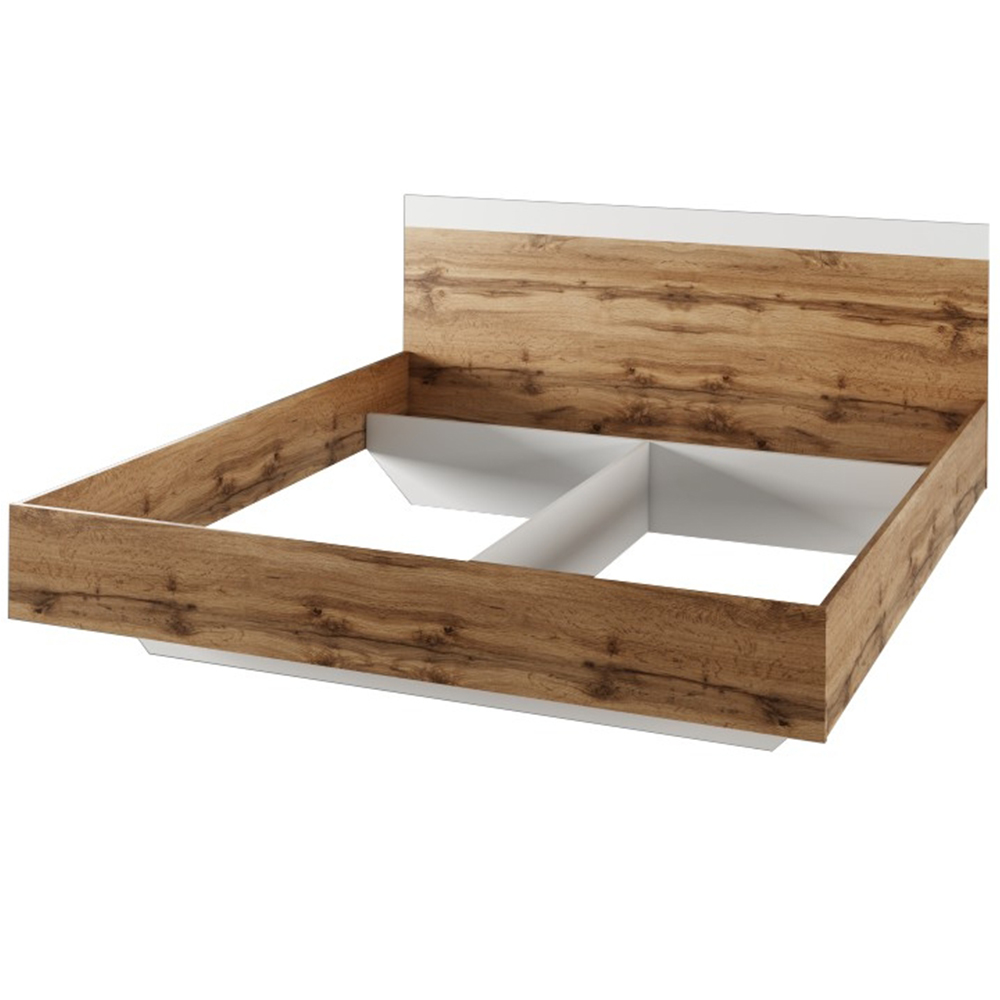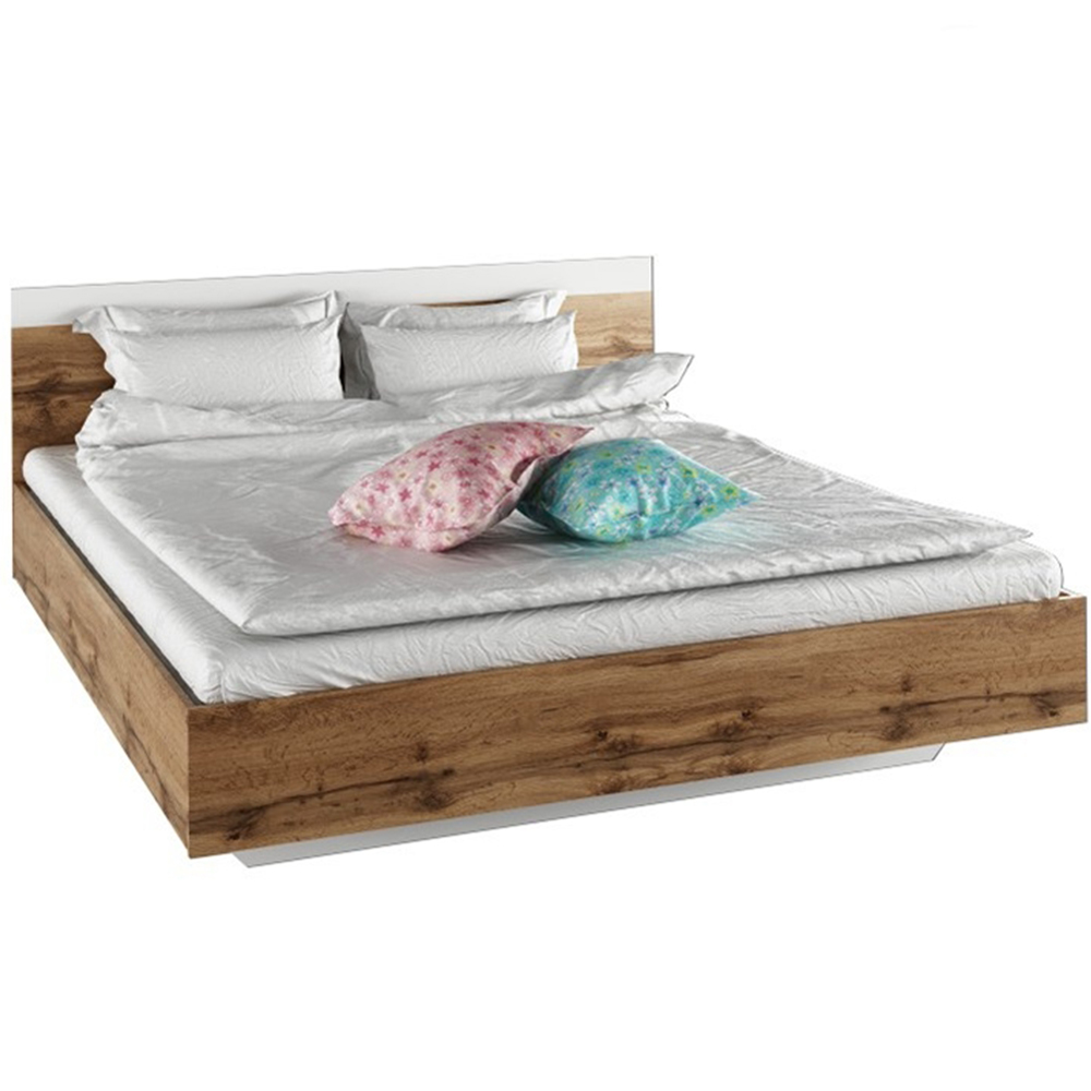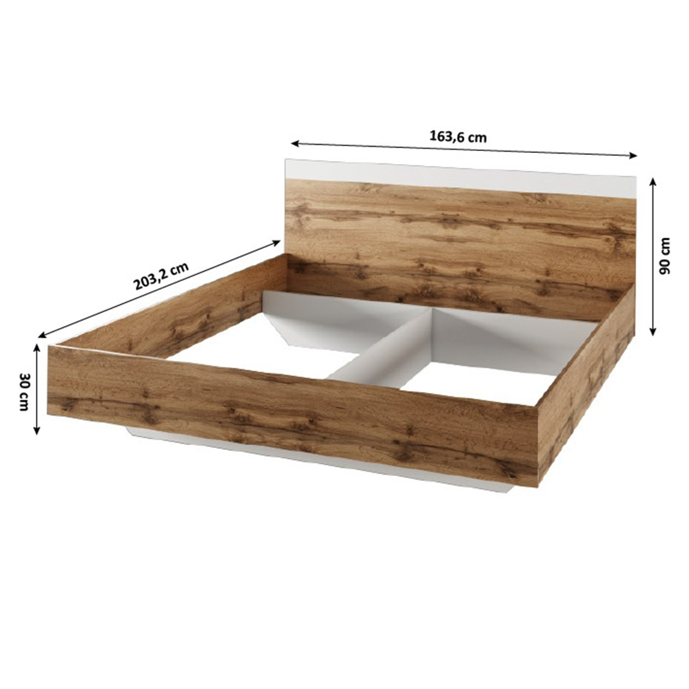 Manželská postel Gaila v dub wotanu a bílé barvě o rozměrech 160x200 cm je pevná a stabilní. Postel je vyrobena z DTD laminovaného materiálu a má tloušťku 16/22 mm. Plocha na spaní je 160x200 cm a výška po roštu je 30 cm. Výška nožiček je 15 cm a výška od země po konec desky je 40 cm. Postel není součástí matrace a roštu, které si můžete objednat z našeho internetového obchodu. Do postele se hodí rošt vcelku.