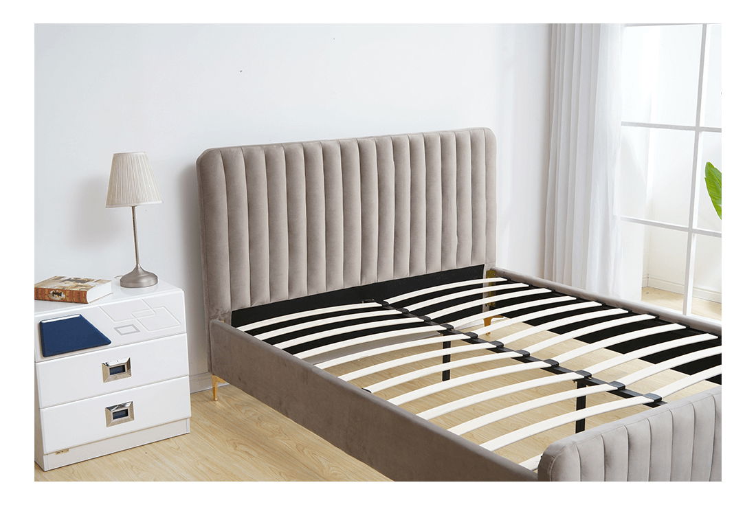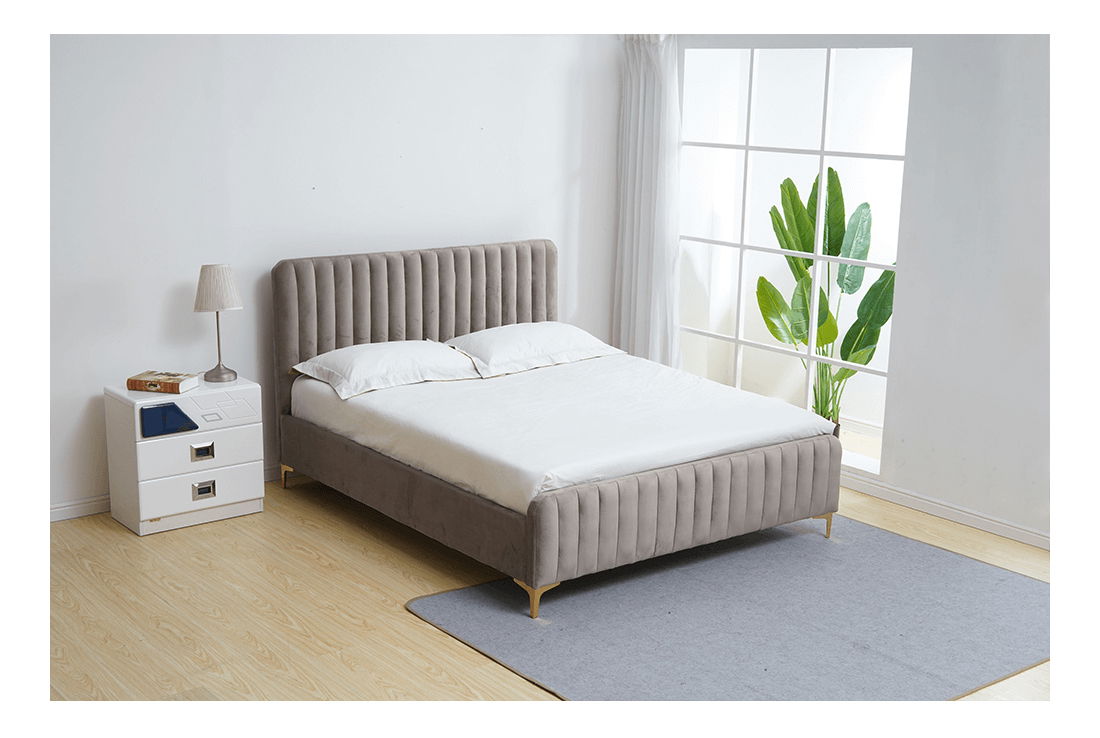 Manželská postel Karilla o rozměrech 160x200 cm a výšce 110 cm je k dispozici v šedohnědé barvě. Čalounění z velvet látka a nohy z kovu chromu ve zlatém matném provedení zaručují elegantní vzhled. Postel je dodávána s lamelovým roštem a umožňuje nosnost na jedno lůžko až 110 kg. Jednoduchá instalace a možnost dokoupení matrace z naší nabídky dělají z této postele ideální řešení pro váš spánek.