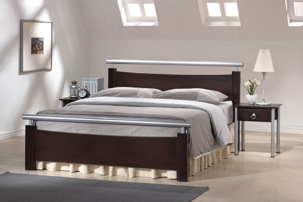 Ultra moderní manželská postel Madryt je vhodná do moderní ložnice. Prvky, které zajímavě obohacujp její design su z kovu v barevném provedení hliníku. Rám postele je ze dřeva v tmavé barvě.