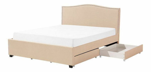Dodejte svému interiéru jemný romantický nádech prostřednictvím této elegantní čalouněné postele. Její jednoduchý, ale velmi stylový design oživí vzhled každé ložnice zařízené v moderním nebo vintage stylu. Rám postele a vysoké čelo s tenkým ozdobným lemováním jsou čalouněny béžovou látkou. Postel má čtyři prostorné úložné zásuvky vystlané netkanou textilií, díky kterým bude snadné udržet v ložnici pořádek.