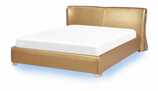 Tato čalouněná kožená postel se stane dokonalým středobodem ložnice. Zlatá barva koženého čalounění vnese do prostoru texturu a teplo a konstrukce z masivního dřeva zaručí stabilitu a klidný spánek. Krátké stříbrné nohy doplňují design postele a lesklý povrch čalounění působí sofistikovaným dojmem. Součástí postele je také LED podsvícení, které navodí romantickou atmosféru v ložnici.