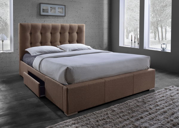 Nádherná čalouněná manželská postel s lamelovým roštem bez matrace s bočním úložným prostorem. Provedení je hnědá látka, plocha lůžka je 160 x 200 cm, nožičky mají kovový nátěr, k posteli doporučujeme zakoupit matraci o rozměru 160 x 200 cm nebo 2 kusy rozměru 80 cm x 200 cm z naší nabídky.