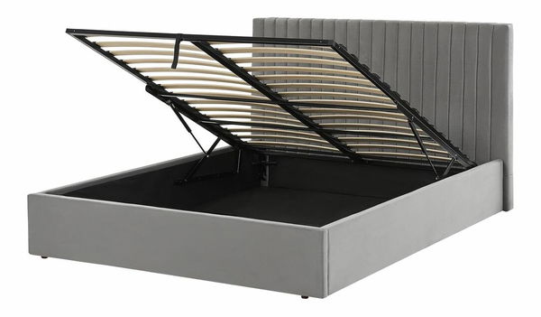 Zkrášlete si ložnici touto čalouněnou postelí a dopřejte si klidný spánek. Postel je čalouněna kvalitním sametem, který je příjemný na dotek, nevyžaduje každodenní údržbu a šedé barvě dodává nádherný lesk. Vysoké prošívané čelo zvýrazňuje design postele a nabízí extra pohodlí. Postel je vybavena úložným prostorem ukrytým pod dřevěným roštem, do kterého budete moci odložit náhradní polštáře, povlečení nebo pyžamo.
