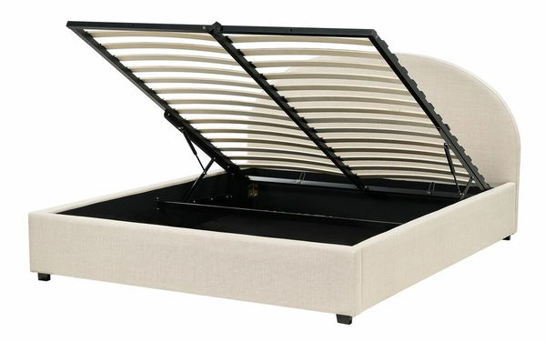 Zaoblené tvary a látkové čalounění s bohatou strukturou vytvářejí design, který je ideální do ložnic zařízených v retro stylu. Postel je čalouněna látkou béžové barvy, která je příjemná na dotek, snadno se udržuje a je trvanlivá. Díky zaoblenému čalouněnému čelu příjemně zútulní vaši ložnici. Postel má také úložný prostor, který je vhodný pro odkládání polštářů nebo ložních přikrývek.