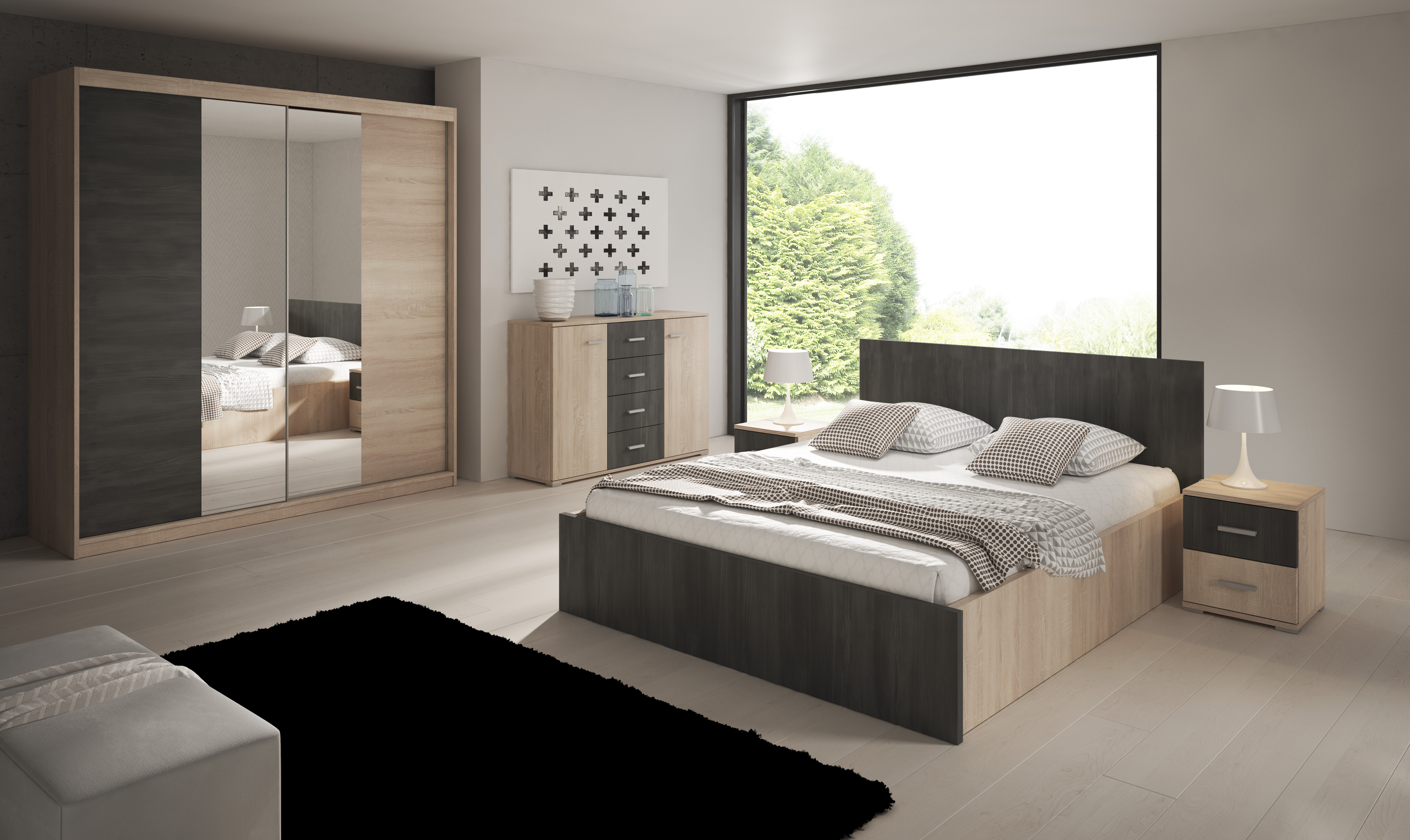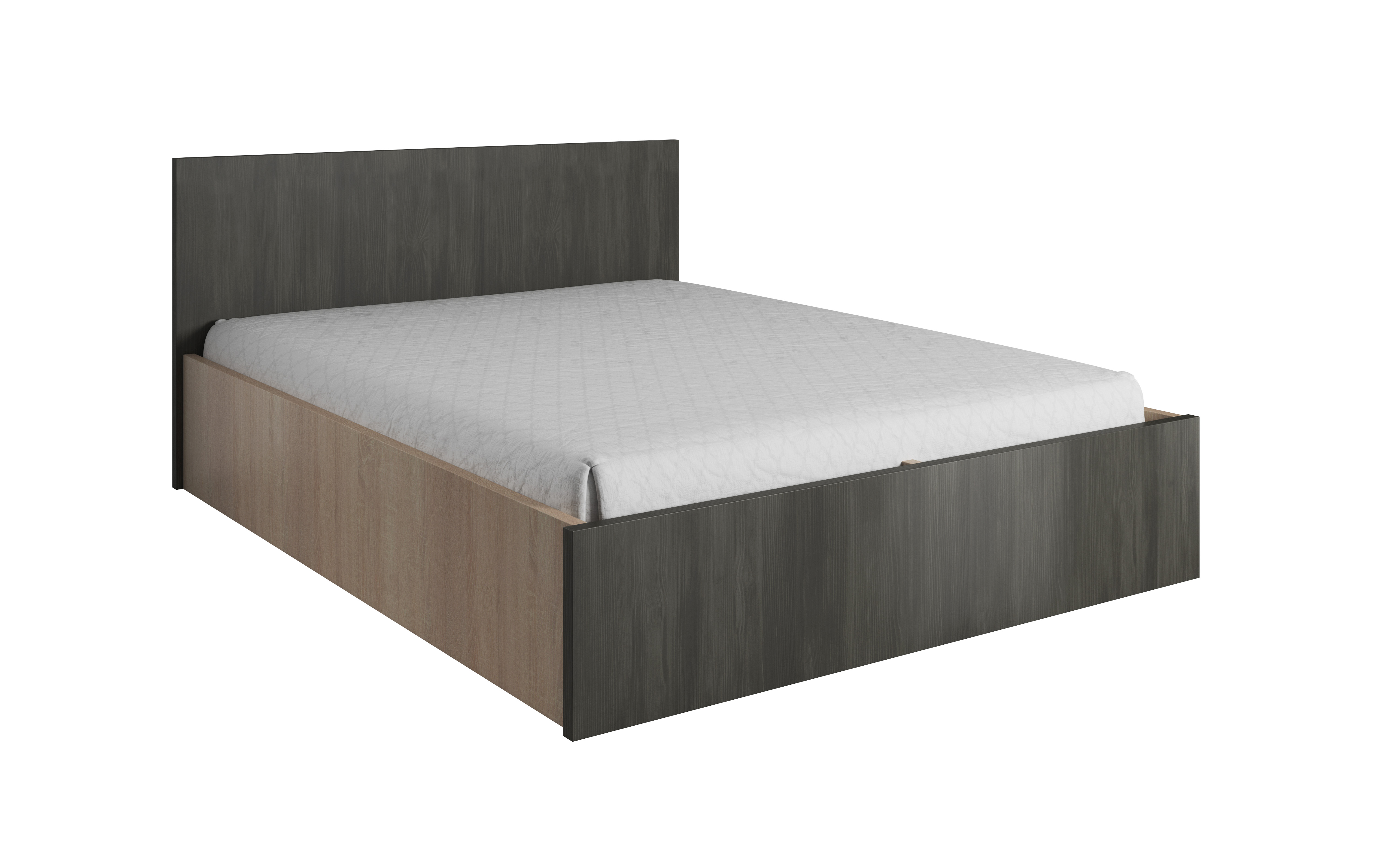 Manželská postel o rozměrech 160 cm x 209 cm x 91 cm je vyhotovena z kombinace dřevotřísky dub sonoma a borovice černé norské. Vnější materiál je tvořen 16 mm dřevotřískou a vnitřní materiál 32 mm dřevotřískou. Postel je vybavena dvěma roštovými deskami, které se otevírají z boku a díky ABS hranám o tloušťce 0,5 mm a 1,7 mm je velmi odolná vůči poškození.