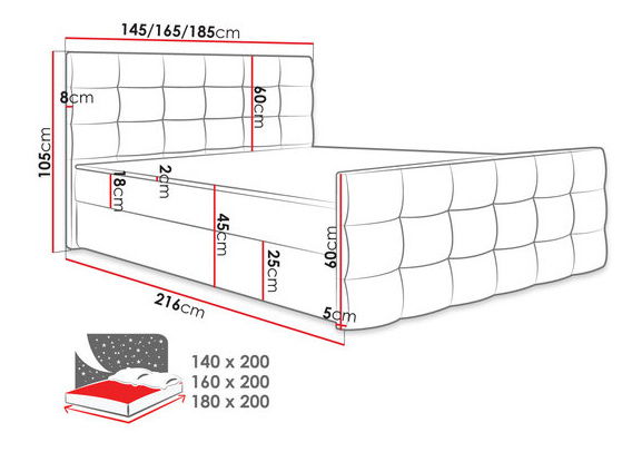 Kontinentální postel je ideální volbou pro ty, kteří hledají pohodlí a styl. Představujeme model Akvore s jednoduchými tvary a elegantním prošíváním, zakončeným jemnými knoflíky připomínajícími krystaly. Tato kontinentální postel s kontejnery spojuje eleganci a moderní funkčnost. Je k dispozici ve třech velikostech: 140, 160 a 180 cm, což vám dává svobodu výběru! Navíc je dostupný ve více barevných provedeních, takže si jistě každý najde to své. Kontinentální postel Akvore má vícevrstvou strukturu, která se skládá z kontejnerů na lůžkoviny, pohodlných bonellových matrací a topperu vybaveného gumičkami proti posunutí. Dostupné rozměry: 140: délka: 216 cm, šířka: 145 cm, výška: 105 cm, plocha na spaní: 140 x 200 cm, rozměry jedné příčky kontejneru (postel má dvě): délka: 195 cm, šířka: 65 cm (vnější délka boxu 70 cm) cm, šířka: 165 cm, výška: 105 cm, plocha na spaní: 160 x 200 cm, rozměry jedné kontejnerové příčky (postel má dvě): délka: 195 cm, šířka: 75 cm (vnější délka boxu 80 cm), výška: 25 cm, 180: délka: 2 cm, plocha na spaní: 180 x 200 cm, rozměry jedné komory (postel má dvě): délka: 195 cm, šířka: 85 cm (vnější délka boxu 90 cm), výška: 25 cm Provedení: rám: 16 mm dřevotříska + 16 mm lamino deska + borovicové 8 + pěna T30, plastové nohy, postel není volně stojící, čelo postele prošívané krystaly, má dva kontejnery na podestýlku - postel standardně se dvěma kontejnery na podestýlku, na obou stranách postele, zvedání díky pružinovému zdvihu, hlavní matrace: bonellové pružiny lůžka) - H3, v horní části - vrchní část matrace (potah Mandula): středně tvrdý, tloušťka 2,5 cm, prošívaný potah, topper vyrobený z nejkvalitnějších hypoalergenních materiálů: antibakteriální a protiplísňový polyesterový úplet 200 gsm, 20 mm PU elasticitou, nízkou náchylností k deformaci, vysokým komfortem používání, netkaná textilie z polyesterových vláken s gramáží 100 g/m2, 35 gsm fleece vyrobený z vysoce kvalitní netkané textilie, 82 gsm polyesterové mikrovlákno: prodyšné, vysoká absorpce roztočem, topper má 4 odolné upevňovací gumy, které zabraňují pohybu matrace, lem: olemován páskou po obvodu, oboustranné - obě strany jsou užitnou plochou, matraci se doporučuje otočit každé 2-3 měsíce, pratelná na 30˚C Možnost zakoupení produktů: Příruční stolek 4