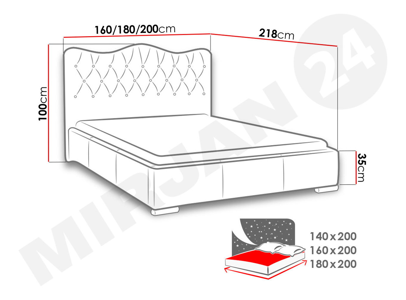 Postel je ideální volbou pro ty, kteří hledají pohodlí a styl. Čalouněná postel Ratoni zaujme svým neobvyklým vzhledem. Perfektní jako prvek klasických a mimořádně elegantních ložnic. Její design vychází z pohádek o princezně. Má charakteristický tvar čela, které bylo dále obohaceno stylovým prošíváním. Ratoni je velmi prostorná a pohodlná postel. Byla vyrobena z nejkvalitnějších materiálů s nadčasovým barevným schématem. Uvnitř je praktický úložný prostor, do kterého můžete umístit povlečení nebo sezónní oblečení. Praktický úložný prostor byl navíc obohacen plynovými automaty, které velmi usnadňují jeho otevírání. Postel je k dispozici ve třech velikostech – rozhodnete se, jakou velikost a barvu si vyberete. Dostupné rozměry: 140 - šířka: 160 cm, výška: 100 cm, délka: 227 cm, plocha na spaní: 140 x 200 cm, 160 - šířka: 180 cm, výška: 100 cm, délka: 227 cm, výška na spaní: 160 x 20 100 cm, délka: 227 cm, plocha na spaní: 180 x 200 cm Provedení: dřevěný rám + dřevotříska, má úložný prostor na ložní prádlo s plynovými automaty, úložný prostor otevřený směrem vzhůru, rám matrace je integrován, nohy jsou poniklovány s rozměry 20 cm lůžko je 120 kg, postel není volně stojící model, záda jsou pokryta silnější vláknitou podhledem Rozměry úložného prostoru: výška: 17 cm délka: (úložný prostor je rozdělen na dvě části): 120 / 200 - 58 x 198 a 50 x 18 68 x 198 160 / 200 - 78 x 198 a 78 x 198 180 / 200 - 88 x 198 a 88 x 198 200 / 200 - 98 x 198 a 98 x 198 Záruka: 24 měsíců