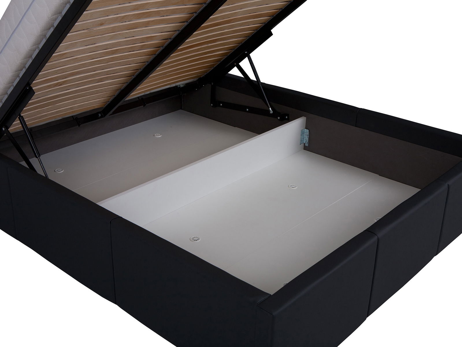 Manželská postel Calabria P o rozměrech 170x200 cm má kovový rošt a úložný prostor. Je vyrobena z ekokůže v grafitové barvě a má výplň z pěny T25. Matrace není zahrnuta v ceně. Balíky mají různé rozměry a hmotnosti.