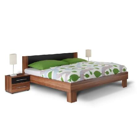Elegantní manželská postel o šířce matrace 180 cm v provedení ořech a černé barvy. Postel je bez úložného prostoru a černá barva je použita na větší části čela postele. K posteli jsou automaticky 2 noční stolky s šedými tenkými úchyty, které se skládají ze dvou zásuvek nad sebou. Horní zásuvka nočního stolku je v bílé barvě.