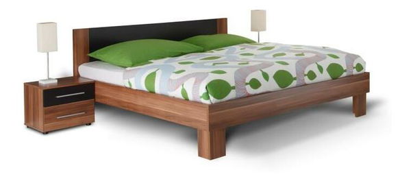 Elegantní manželská postel o šířce matrace 180 cm v provedení ořech a černé barvy. Postel je bez úložného prostoru a černá barva je použita na větší části čela postele. K posteli jsou automaticky 2 noční stolky s šedými tenkými úchyty, které se skládají ze dvou zásuvek nad sebou. Horní zásuvka nočního stolku je v bílé barvě.