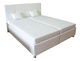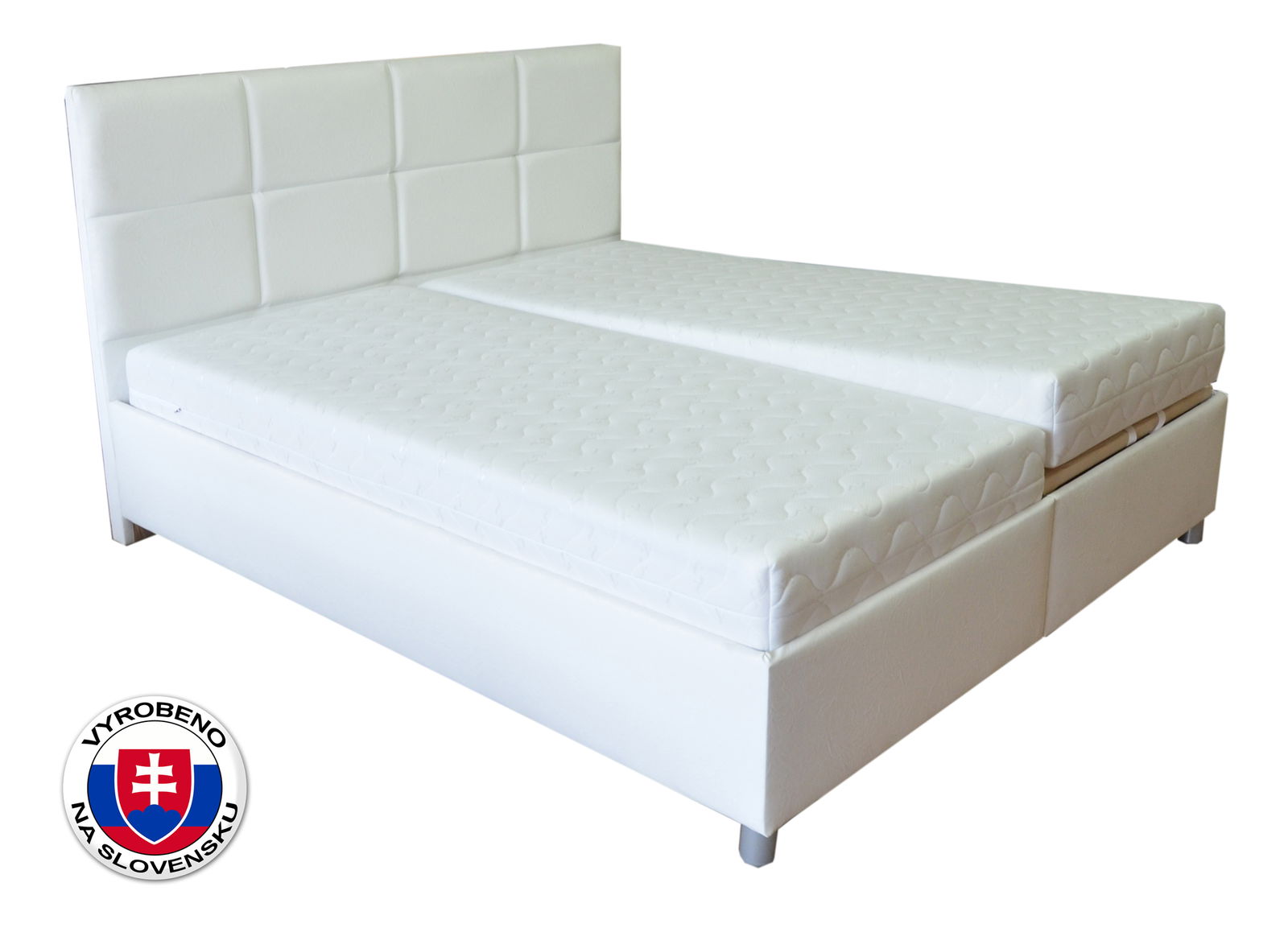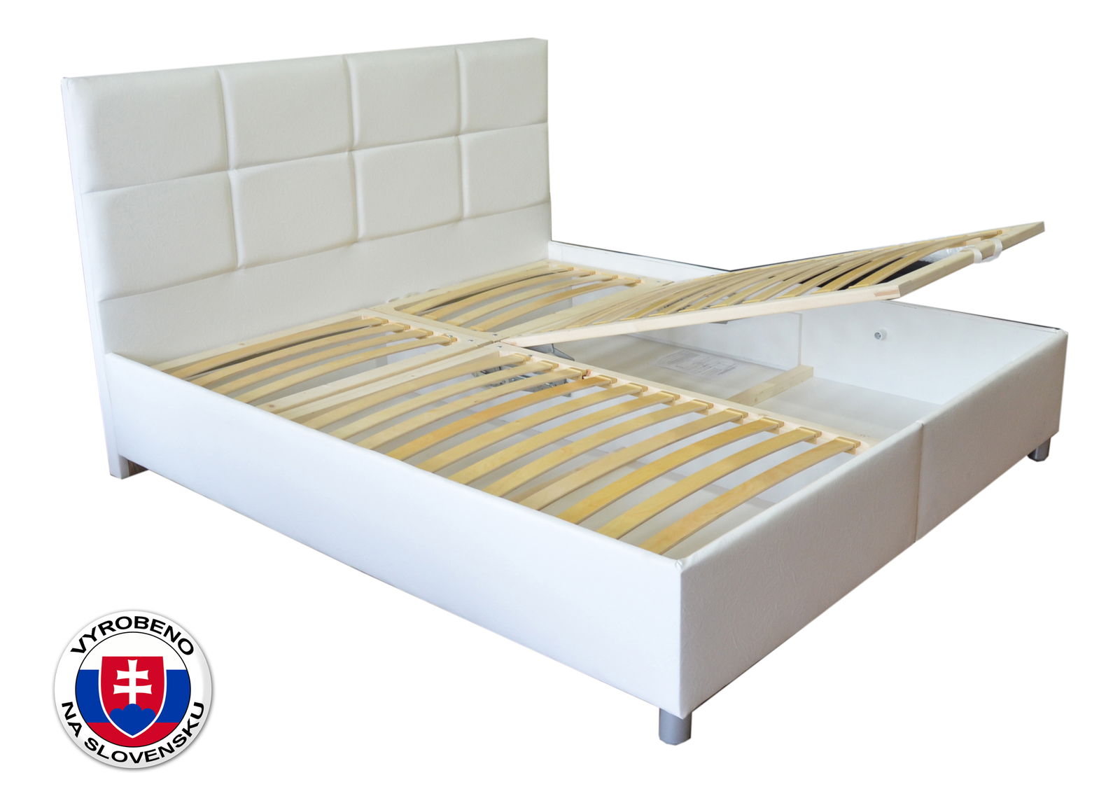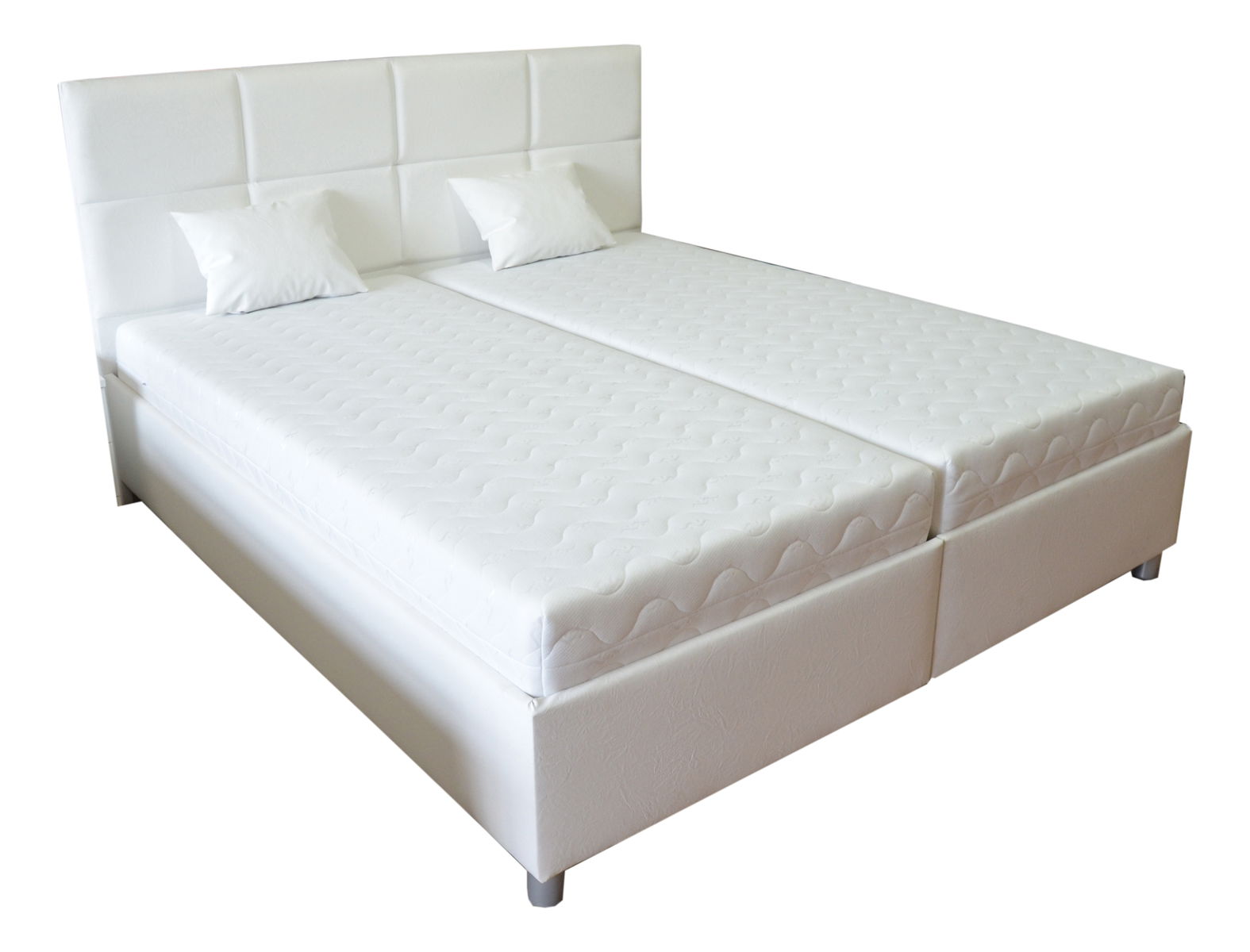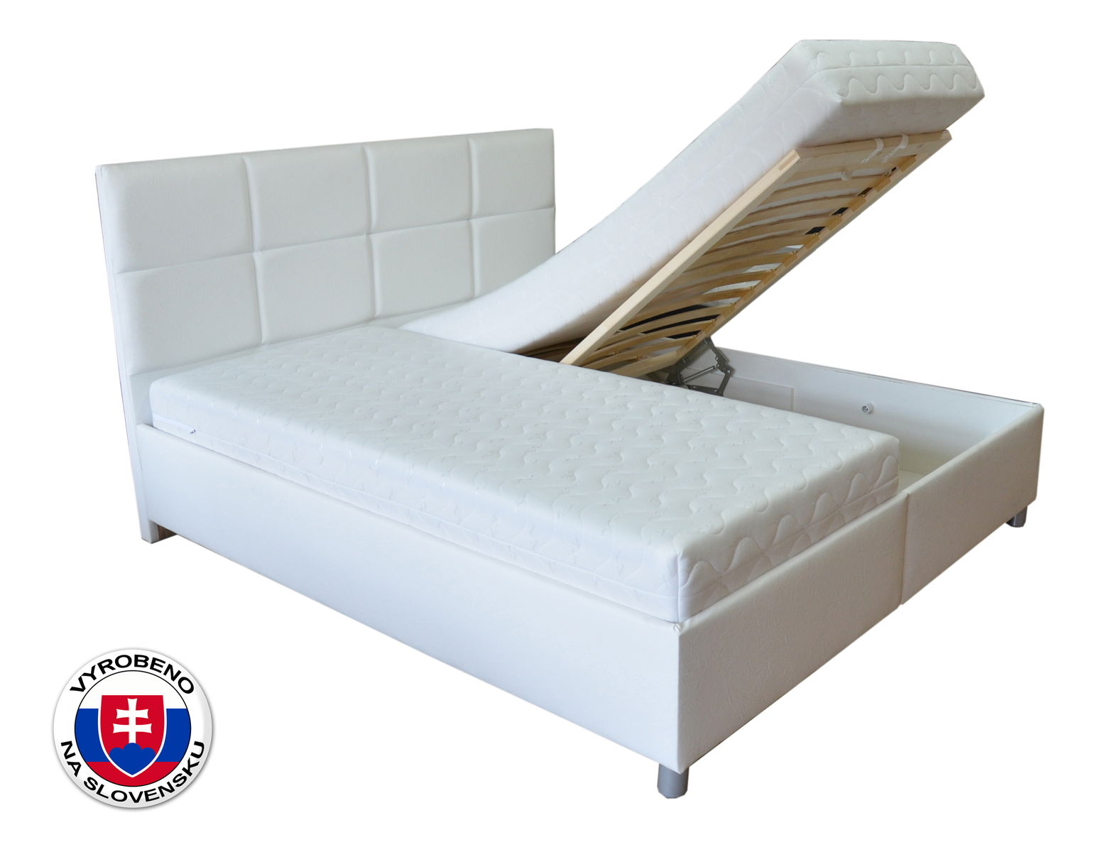 Elegantní manželská postel s vysokým čelem a vyjímatelnými matracemi. Výplň čela je z molitanu o tloušťce 3 cm. Výška čela je 116 cm. Vyjímatelné matrace jsou uloženy na lamelovém roštu, který má 15 ks lamel v masivním smrkovém rámu. Úložný prostor je přístupný od nohou. Pro zvýšení pohodlí je polohovatelný u hlavy. Postel je uložena na kovových nožkách výšky 8,5 cm.