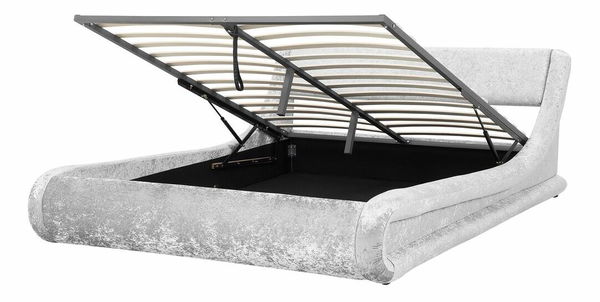Dodejte své ložnici elegantní vzhled pomocí této moderní postele se stříbrným sametovým čalouněním. Originální design se vyznačuje oblými tvary, které působí futuristickým dojmem. Postel je precizně vyrobena z vysoce kvalitních materiálů, které se navzájem dokonale doplňují a zaručují dlouhou životnost nábytku. Součástí postele je i úložný prostor polstrovaný netkanou textilií, který nabízí dodatečný prostor pro povlečení a polštáře.