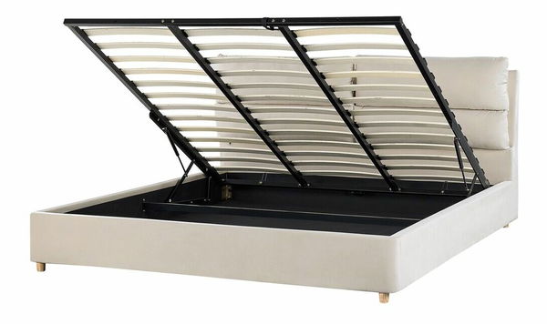 Tato elegantní postel s moderním designem má rám s vysokým čelem a velký úložný prostor. Díky obdélníkovému tvaru působí tradičním dojmem, ale tlusté opěradlo s tlustými polštáři jí dodává moderní šmrnc. Štíhlé, ale pevné a odolné nohy neodvádějí pozornost od elegantního designu a zajišťují stabilitu konstrukce. Postel je čalouněna světle béžovou sametovou látkou, která zvýrazňuje její sofistikovaný a poutavý vzhled.