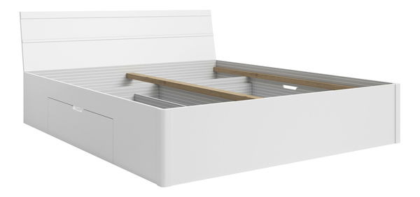 Manželská postel s designovým čelem a praktickými šuplíky pro uložení ložního prádla, polštářů a peřin. Postel je vyrobena z laminované dřevotřísky a má snadno omyvatelný povrch bez zápachu. Vysouvající se úložný prostor na kolečkách má maximální zatížení 10 kg a zásuvky jsou umístěny na boku postele. ABS hrany mají tloušťku 0,6 mm a kovový mechanismus zajišťuje spolehlivé funkční vlastnosti. K posteli je doporučená matrace se zabudovaným roštem a balíky jsou rozděleny na 3 části.